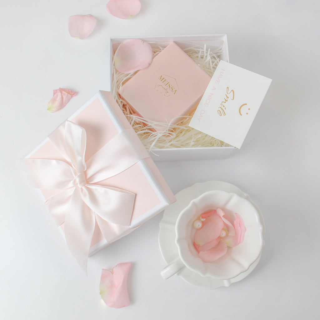 • Your jewelry will be packaged with a box and jewelry pouch, then placed inside a gift box.
