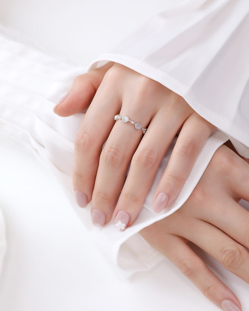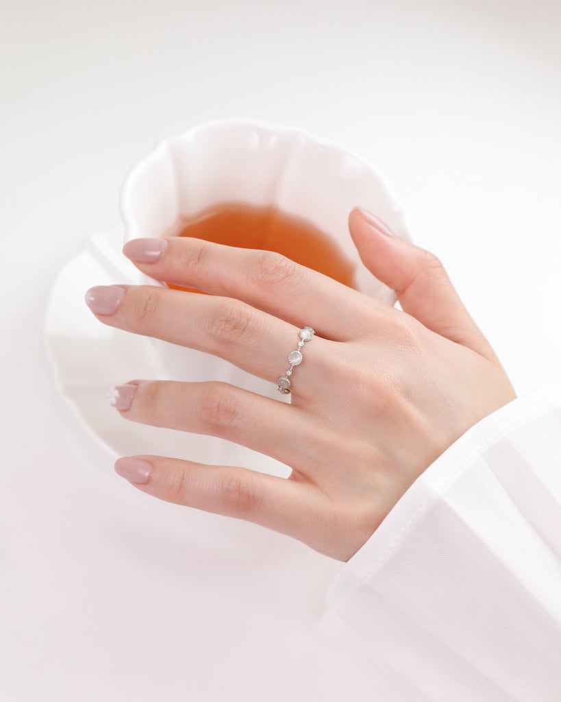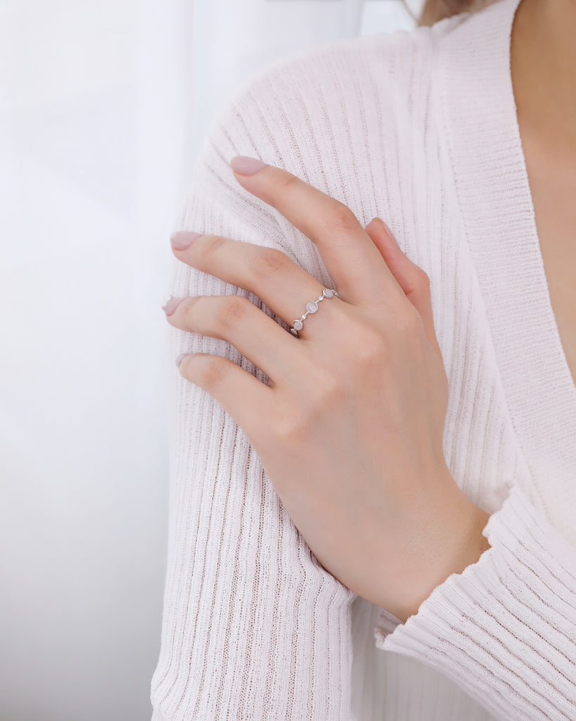 I really like this ring. It's more on the dainty side but doesn't feel flimsy. The ring itself is a little more snug on certain fingers but It fits well on others so It doesn't bother me much. It arrived on time and looks really pretty.