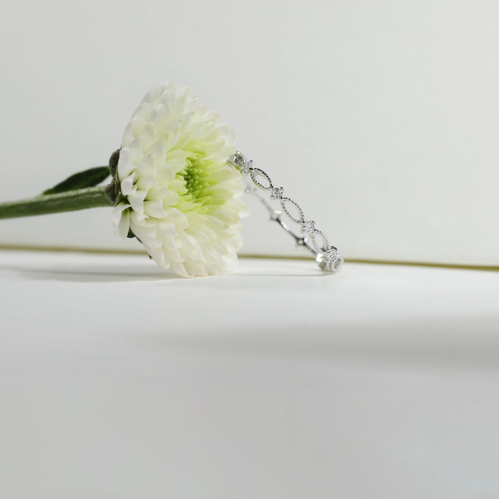 This ring is delicate and beautiful. Its unique because of the two different styles on each side. Very happy with it.